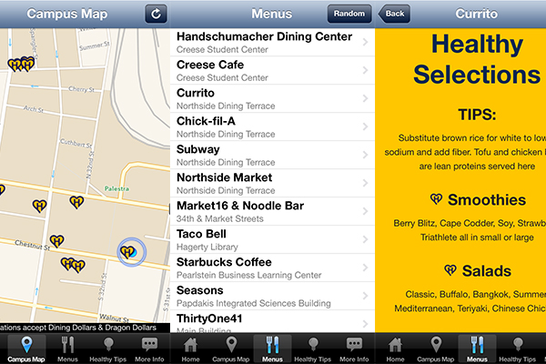 The free app, now available in the iTunes App Store[2] , lists all the “Healthy Selections”-approved menu items at University-owned or -leased dining locations on the University City Campus. The selections are accessible through a list or through a GPS-enabled map. The app also provides guidelines and tips for healthy eating.